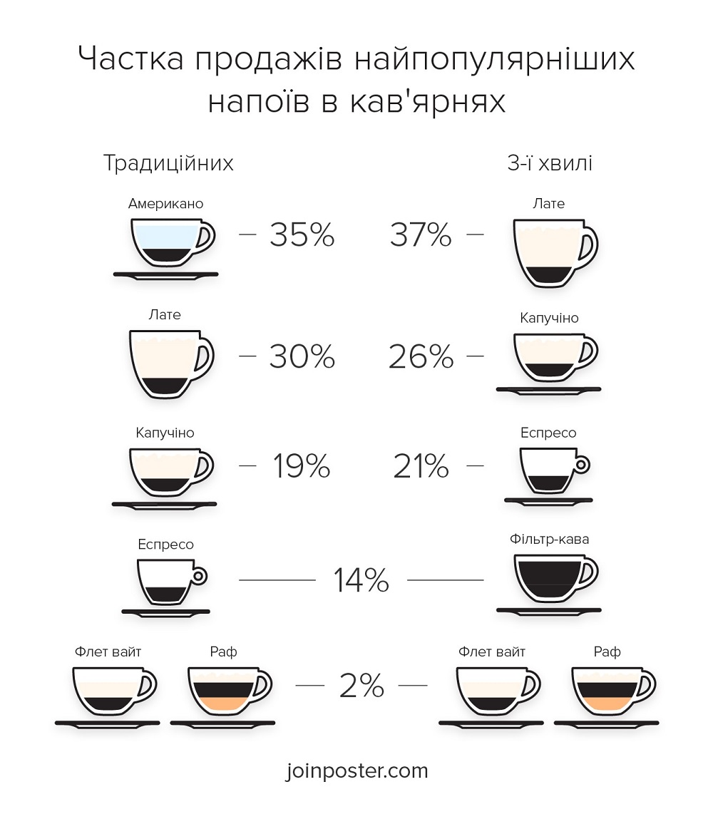 За даними аналітиків Poster, американо — як і раніше найпопулярніший напій гостей традиційних кав’ярень. Слідом йдуть лате, капучіно, еспресо. П’ятірку найбільш улюблених кавових напоїв замикають модні флет вайт і раф, проте їх обирають поки що майже в 18 разів рідше, ніж американо.
