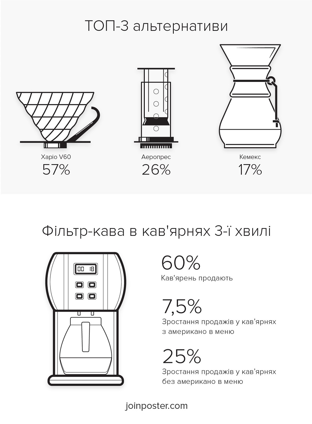 За даними дослідження Poster, 60% кав’ярень третьої хвилі в Україні продають фільтр-каву (батч-брю), тоді як в традиційних кав’ярнях — фільтр-машина досі велика рідкість. За рік продажі фільтр-кави в кав’ярнях третьої хвилі, які пропонують в меню американо, виросли на 7,5%, в кав’ярнях, які не готують американо — на 25%.