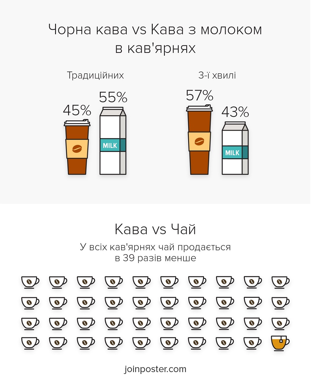 Українці, як і раніше, віддають перевагу каві з молоком. У традиційних кав’ярнях близько 55% продажів кави займають напої з додаванням молока. У кав’ярнях третьої хвилі цей показник – 43%, частина відтягує на себе безмолочна альтернатива.