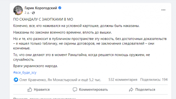 Може до чиїхось липких долоньок і прилипло кілька мільярдів, а може і не прилипло, я не знаю. От що я знаю точно, що опублікованої інфи недостатньо, аби публічно хуїсосити Міноборони. Як мінімум, їм мали б дати слово перед публікаціїю”, — написав він.