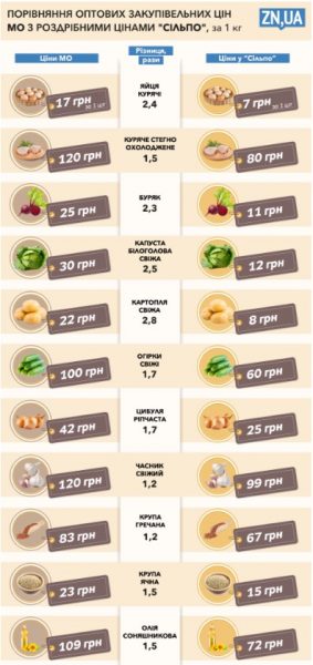 В статтю також додається інфографіка з логотипом ZN.ua у вигляді порівняльної таблички — ціни у Договорі МО та ціни у Сільпо.