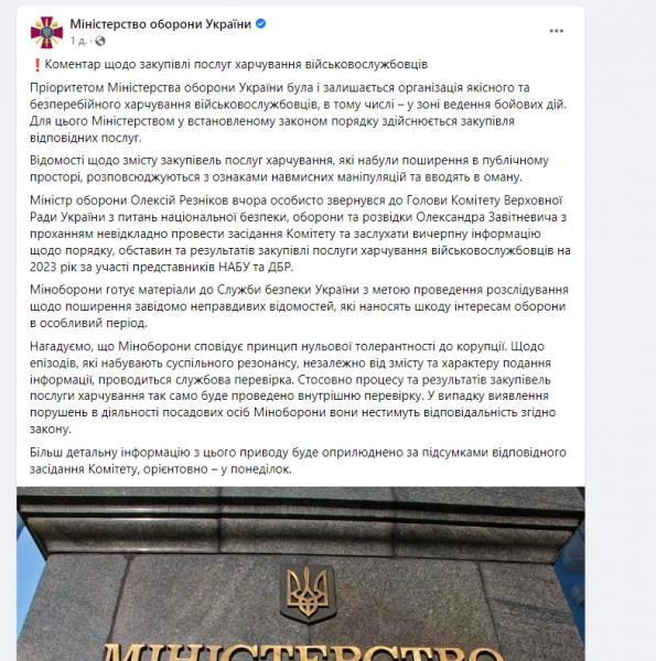 «Пріоритетом Міністерства оборони України була і залишається організація якісного та безперебійного харчування військовослужбовців, в тому числі – у зоні ведення бойових дій. Для цього Міністерством у встановленому законом порядку здійснюється закупівля відповідних послуг.
