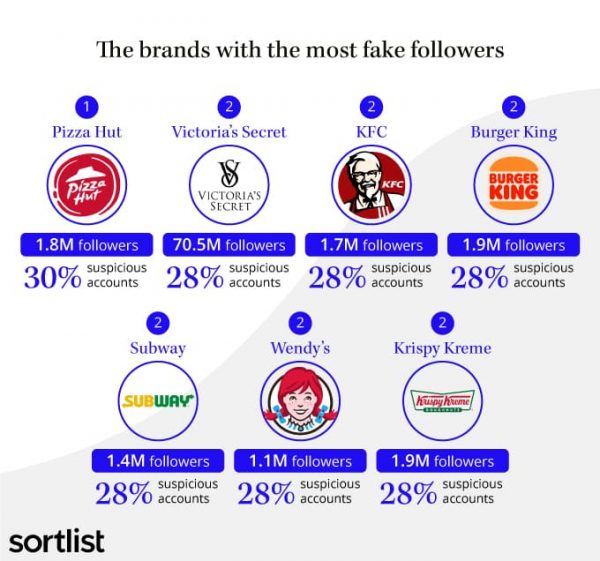 За друге місце у списку борються одразу п’ять великих американських виробників фастфуду — KFC, Burger King, Subway, Wendy’s та Krispy Kreme. Частка «підозрілих» акаунтів серед їх аудиторії досягла 28%.