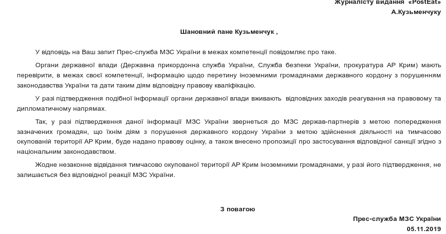 В сообщении от пресс-службы идёт речь о том, что факт незаконного визита в оккупированный Крым должны проверить и подтвердить Государственная пограничная служба Украины, Служба безопасности Украины и прокуратура АР Крым. Если эта информация подтвердится, то ведомство обратится в МИД стран-партнеров с просьбой уведомить своих граждан о том, что их действия получат правовую оценку. Соответствующим службам будет предложено применить к нарушителям санкции.