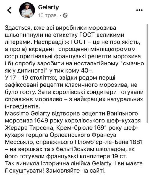 Творець і шеф-кухар Gelarty Массімо Джеларті розповів у Facebook, що випустив нову історичну лінійку морозива та пояснив, що таке ГОСТ.
