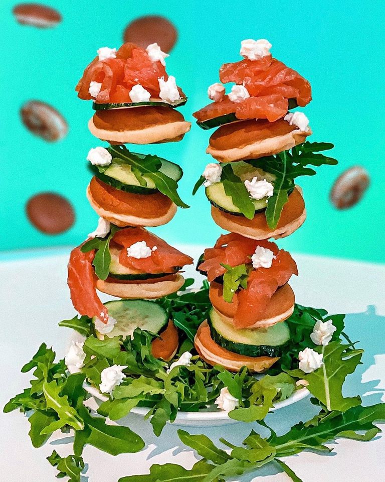 Наприклад, солоні панкейки подають з куркою та грибами або з лососем та крем-сиром. Солоні млинці — з шинкою та сиром або куркою та грибами.