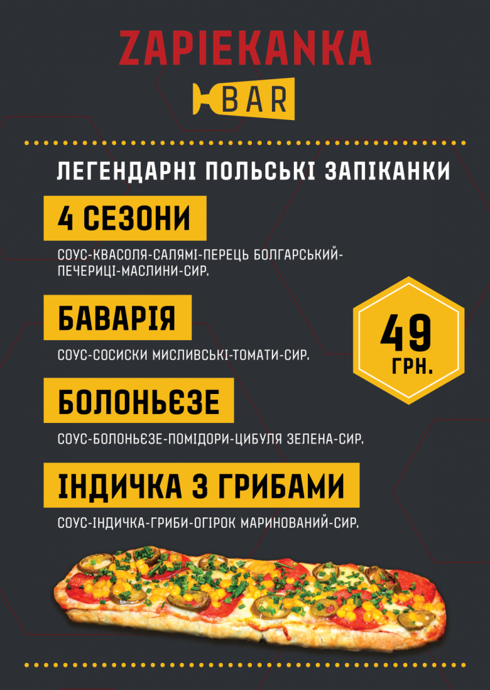 У меню ви також знайдете цікаві авторські коктейлі на основі наливок. А якщо зголодніли, завжди можна поласувати істинним польським стріт-фудом – легендарною запіканкою (наприклад, з індичкою та грибами або запіканкою «Баварія» з мисливськими сосисками, томатами та сиром). Для всіх запіканок у закладі фіксована вартість – 49 грн.