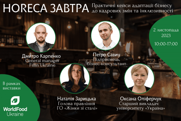 Запрошуємо на конференцію «HoReCa Завтра. Практичні кейси адаптації бізнесу до кадрових змін та інклюзивності», що відбудеться 2 листопада 2023 у рамках виставки продуктів харчування та напоїв WorldFood Ukraine.