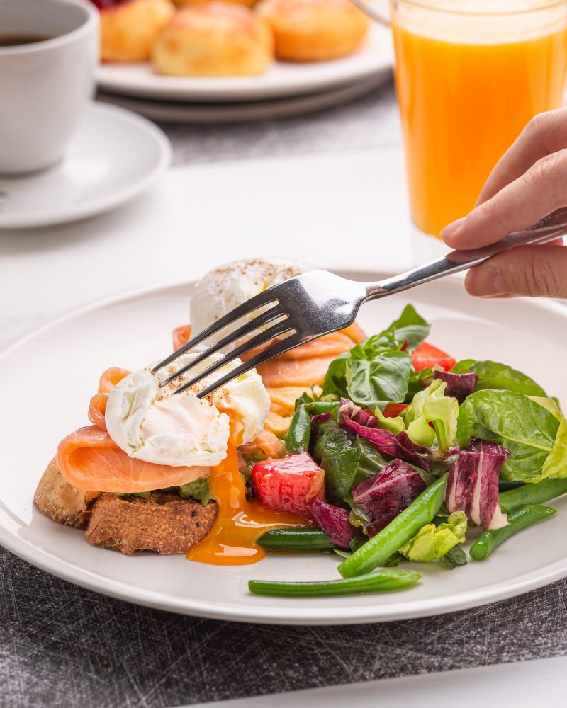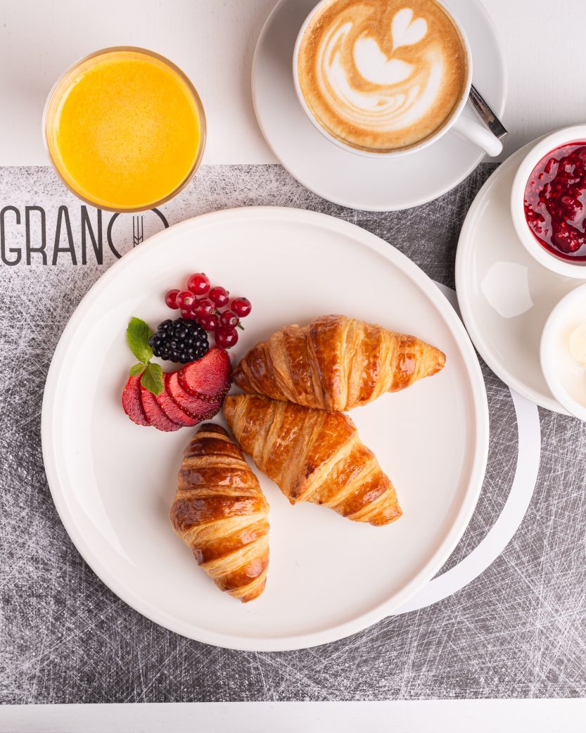 Класичні круасани з вершковим маслом, йогурт з гранолою, традиційна вівсянка з фруктами, надзвичайно ніжні сирники зі сметаною, яйця пашот на гречаних тостах з лососем, авокадо, томатами і спаржевою квасолею, скребли – з ростбіфом і овочами гриль та з креветками і томатами.