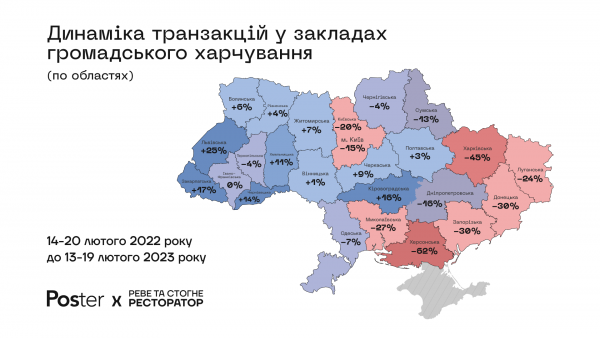 Кількість транзакцій у київських закладах у лютому впала на 15% на минулому тижні у порівнянні із таким же тижнем торік, до повномасштабного вторгнення. Тим чином, лютневий трафік у Львові зріс на 25% від довоєнних показників. Такі дані дослідження приводить українська компанія з автоматизації закладів Poster у власному ресторанному медіа «Реве та стогне ресторатор».