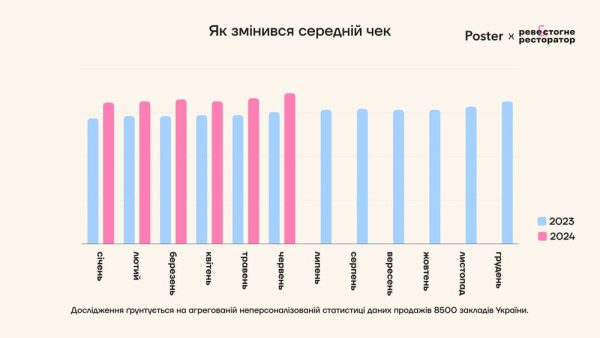 Середній чек закладів громадського харчування зріс на 13% до 148 грн в I півріччі 2024 року у порівнянні з I півріччям 2023 року внаслідок підняття цін. Про це пише ресторанне медіа «Реве та стогне ресторатор» з посиланням на дослідження української компанії з автоматизації закладів Poster