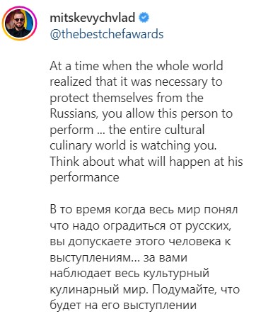 Українська гастрономічна спільнота різко розкритикувала таку позицію The Best Chef, шефи та гастродіячі висловились щодо неприпустимості участі представників країни-агресора в рамках такої міжнародної події, як The Best Chef.