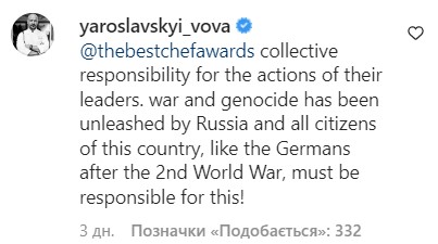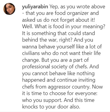 Чи доцільні сьогодні, у 21 столітті, намагання  знецінювати спроби української гастрономічної спільноти привернути увагу до злочинів росії в Україні, шляхом запису та публікації відео-заяви про їжу та любов?!