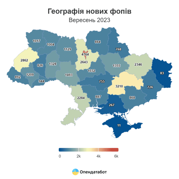 П’ята частина від усіх нових ФОПів  — 21% або ж 7407 — відкривається на Київщині. Друге й третє місце за кількістю нових справ посідають Дніпропетровщина (3210) та Львівщина (2862).