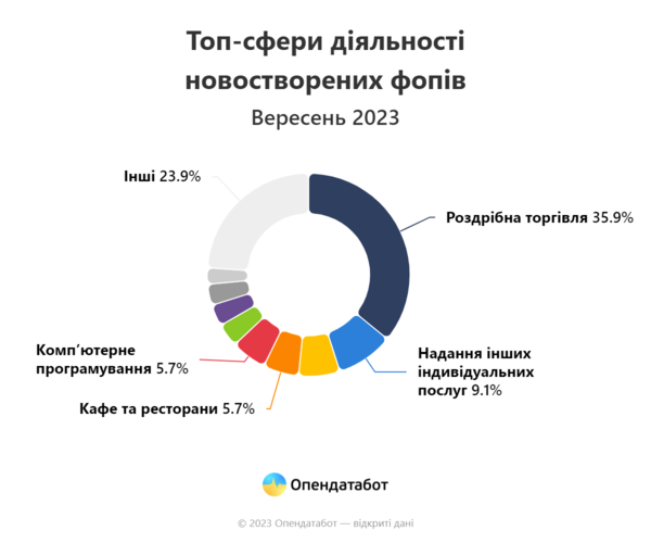 У Опендатаботі додають, що найбільш затребувані сфери, у яких відкриваються нові справи, не змінюються. Майже половина нових ФОПів — 43% — відкриваються у сфері торгівлі: роздрібна торгівля (12 777 від загальної кількості новостворених справ) та оптова торгівля — 2343 ФОПи. У топ-3 також потрапили справи з надання індивідуальних послуг — 3244.