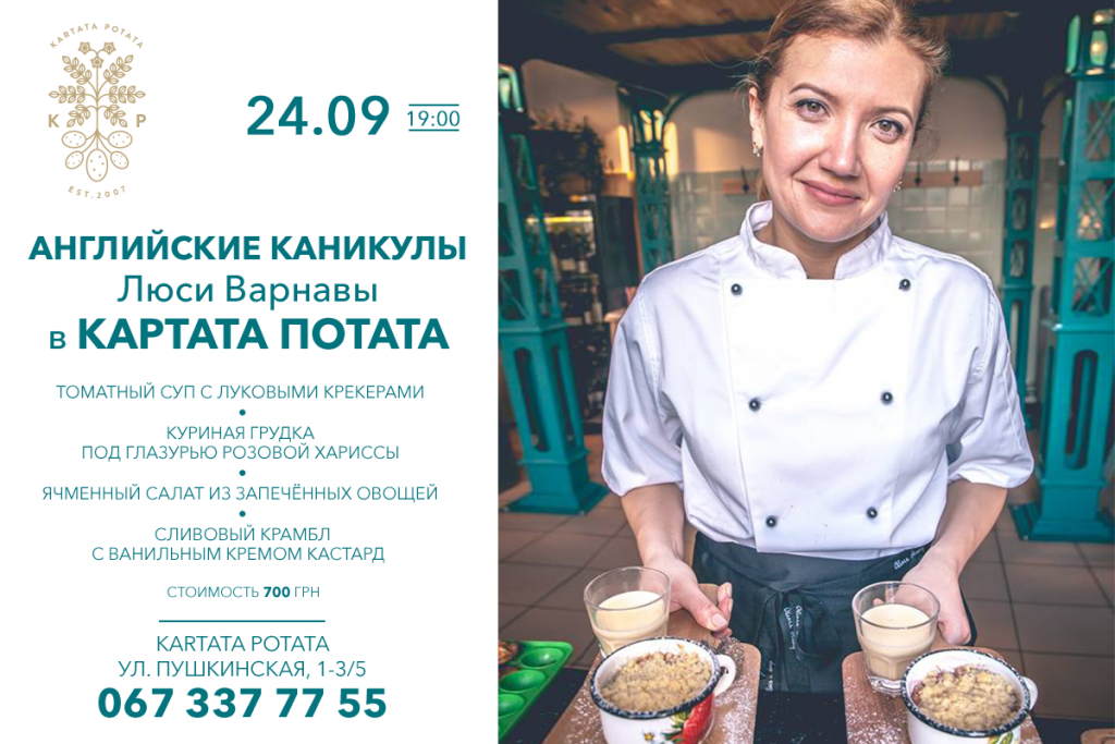 Люси летит в Киев из Лондона и 28 сентября проведёт мастер-класс, у нас в Kartata Potata! Мы окунемся в настоящую английскую осень и под руководством Люси приготовим самый настоящий британский ужин.