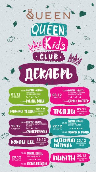 Декабрь в Queen Country Club будет самым ярким! Приезжай с семьей – деток каждые выходные ждет развлекательная программа, пока ты отдыхаешь на любимой панорамной террасе в сосновом лесу. Сохраняй расписание, чтобы не потерять!