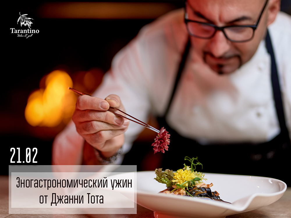 21 февраля Tarantino italian & grill приглашает на удивительный эногастрономический ужин от маэстро Джанни Тота. В этот вечер выдающийся итальянский шеф-повар представит гостям авторское меню, которое будет действовать в течение двух вечеров 21 и 22 февраля. Подчеркнет тонкий вкус интересных сочетаний идеально подобранное вино.