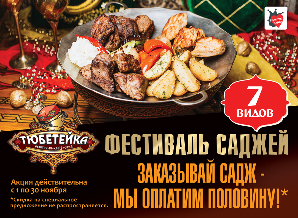 В ноябре ресторан восточной кухни Тюбетейка на Тарасовской приглашает вас на фестиваль саджей. Заказывайте любой садж из специального меню фестиваля и платите только половину стоимости.
