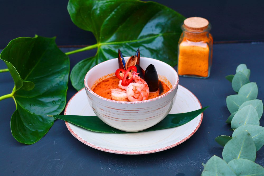 Причудливое сочетание необычных ингредиентов, азиатских специй и кисло-сладкий вкус супа невозможно забыть. Это настоящее солнце в тарелке с ароматным шлейфом лемонграсса и цедры лайма.