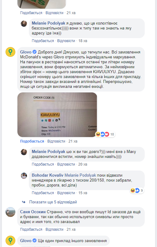 «UPD: історія на мільйон. щойно зі мною говорила дуже приємна людина з PR-відділу McDonalds. ці чудові три букви — закінчення коду замовлення.))) людина, яка працює в Маку і пише ті коди машинально + наша звиклість до публічного осуду + збіг латинських «XYU» і кириличного написання = супер кейс, який ілюструє різницю між роботами і людиною.) артіфішел інтелідженс, курча!))) всі взаємно поперепрошувалися.) як сказала мені працівниця «в нас одна половина відділу посивіла від стресу, а та яка не посивіла просто ще не чула про цей випадок.»)».