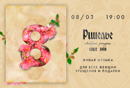 Милые, обаятельные, нежные и очаровательные, ресторан «Ришелье» любит Вас все 365 дней в году, но 8 МАРТА хотелось бы особо красочно и музыкально выразить Вам свое почтение!