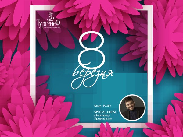 Женская красота нас вдохновляет, женская мудрость нас удивляет, а женская забота оберегает. В Международный женский день ресторан “ТургенеФ” сделает все возможное, чтобы в этот день каждая гостья почувствовала себя по-особенному красивой, нежной и желанной!