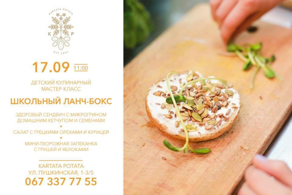 В это воскресенье, 17 сентября на детском кулинарном мастер-классе в Kartata Potata мы учимся готовить вкусное и полезное школьное меню — на радость мамам и на зависть одноклассникам!