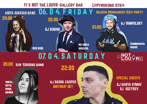 6 апреля в 20:00 заиграет neo soul ANITA Avakian Band, а дальше танцы под сеты Dj Evgeniy Sukhoi (nu disco) и Dj Andrey YampolSky (house).