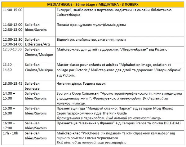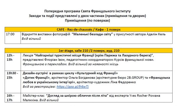 Майстер-класи, ознайомчі уроки французької мови, зустрічі з цікавими людьми, конкурси та смаколики від улюблених кафе та ресторанів. Ось тільки деякі з них: караоке, кулінарні майстер-класи, хіп-хоп та брейкінг, сирна дегустація, творчий конкурс. Зустрічі про найсмачніші місця Парижа, про найгарніші місця Франції, про французький дизайн, про ароматерапію, догляд за шкірою після літа та про навчання у Франці.