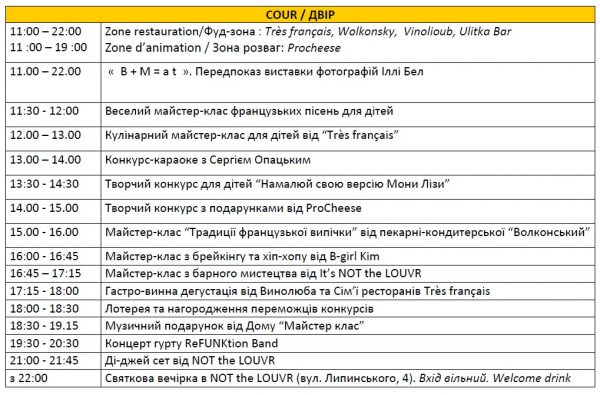 Окремо, важливо відзначити вечірні події Свята: Посол Франції в Україні, пані Ізабель Дюмон розповість про початок Року французької мови в Україні та представить нове керівництво Французького інституту, будуть розіграні призи від партнерів Французького інституту, Дім “Майстер-клас” готує музичний подарунок, а наостанок, запальні ReFUNKtion band безкомпромісно змусять танцювати всіх відвідувачів Свята!