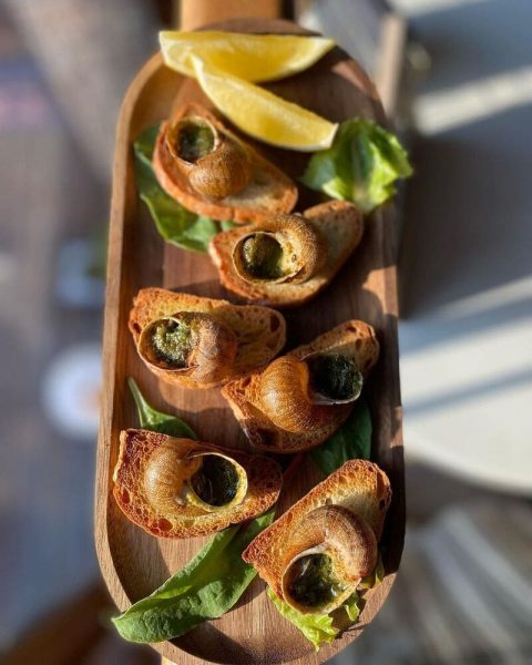 Страви: київські фермерські равлики з грінками пивного хліба – 320 грн.