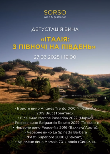 Ресторан SORSO Wine&Gastrobar запрошує на вечір, присвячений винам Італії, де ви зможете здійснити подорож від прохолодних альпійських вершин до сонячних південних берегів. Дегустація «Італія з Півночі на Південь» – це унікальна можливість відчути різноманіття італійських вин, кожне з яких розповість свою неповторну історію.
