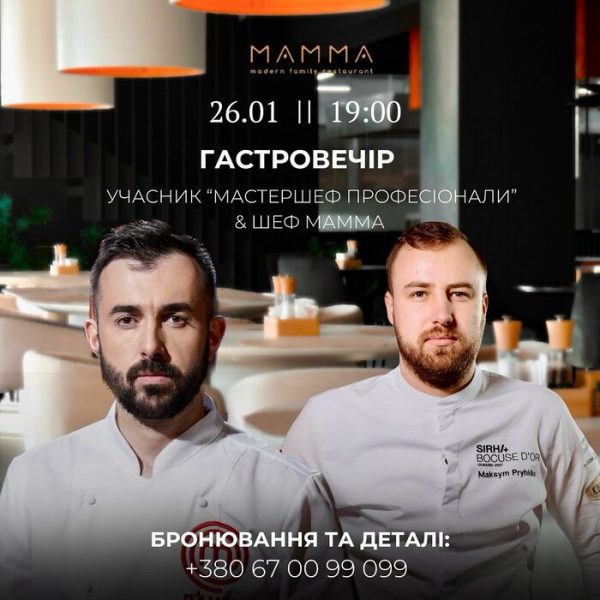 «На вас чекатимуть 5 авторських страв від учасника кулінарного шоу «Мастершеф Професіонали» та співзасновника @molode_steblo талановитого шеф-кухаря Данка Матійчука і нашого незамінного шеф-кухаря ресторану МАММА Максима Прихідька», – розповідають організатори.