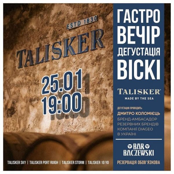 У «Ресторація «Бачевських» відбудеться дегустація віскі з бренд-амбасадором резервних брендів компанії Diageo в Україні Дмитром Коломійцем.