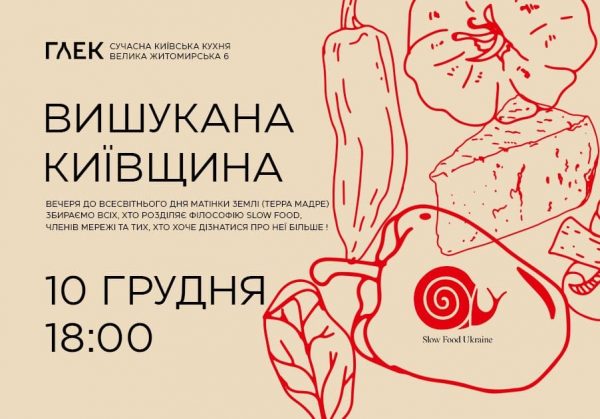 Вечеря «Вишукана Київщина» – несподіваний пейрінг кращих зразків вин Київщини та страв з використанням продуктів виробників Київщини. Збирають всіх, хто розділяє філософію Slow Food, членів мережі та тих, хто хоче дізнатися про неї більше.