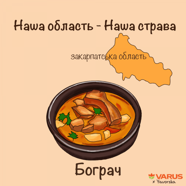 Неможливо уявити Закарпаття без пікантного, запашного м’ясного бограчу. Страва має угорське коріння, його назва походить від угорського слова “казан”. Обов’язковим інгредієнтом страви, крім м’яса, є паприка, яка і робить бограч пікантним.