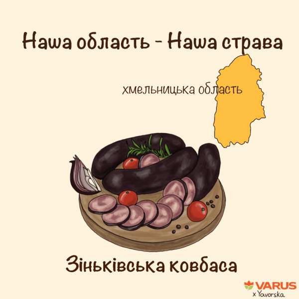 Хмельниччина відома легендарної Зіньківською ковбасою, яку кілька років тому навіть внесли до переліку елементів нематеріальної культурної спадщини. Оригінальний рецепт цієї страви походить з мальовничого села Зіньків, де секрети приготування копченої ковбаси передають від покоління до покоління вже понад 300 років. Характерною особливістю зіньківської ковбаси є чорний колір, якого досягають завдяки приготуванню методом гарячого копчення.