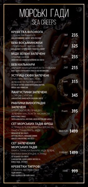 Выбор редакции: клешни королевского краба – 650 грн, дорадо – от 395 грн, филе кликача – 580 грн, канадский лобстер – 2380 грн, осьминог с томатами гриль, картошкой и шпинатом – 720 грн, паста в сливочном соусе с морепродуктами – 355 грн, дикая креветка с головой – 225 грн, гребешок – 460 грн, фирменный салат с морепродуктами – 465 грн.