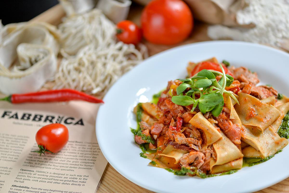 Fabbrica.Kyiv – заведение, где используют исключительно украинские продукты, отдают предпочтение локальным и фермерским. В ресторане ежедневно мелят свежую муку на мельнице ручной работы от Диттера Вальднера из Австрии. Зерно твердых сортов, которое используется в ресторане, выращивается монахом Алексеем под Уманью. В заведении можно наблюдать практически за всеми процессами приготовления блюд, поэтому каждый гость может убедиться в качестве своей пасты. Рекомендуем попробовать паппарделле со свининой – 94 грн., тальятелле с миксом грибов – 89 грн., спагетти с жареным телячьим мозгом – 82 грн., спагетти с грибами, вялеными томатами и пореем – 78 грн., фарфалле с форелью и шпинатом – 134 грн. Также домой с собой можно взять пасту ручной работы (65 грн.).
