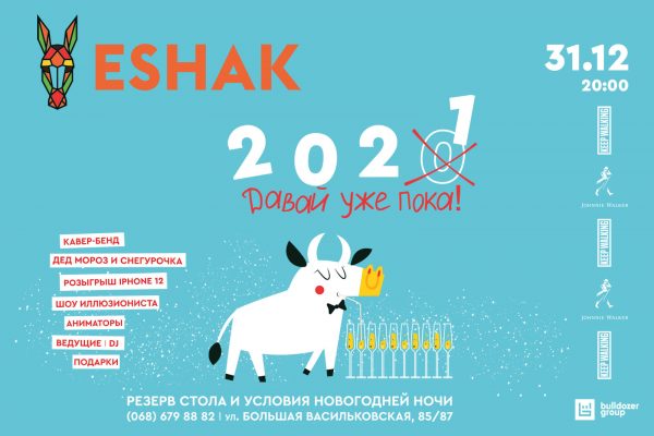 Cімейний ресторан східної кухні ESHAK від міжнародної мережі закладів Bulldozer Group знаходиться на Теремках. Меню об’єднує чотири напрямки: українську, узбецьку, грузинську і європейську кухню. Для маленьких гостей є digital дитяча кімната з PlayStation VR, нянями, плазмами, настільним хокеєм і іграми. Зустрічати 2021 рік в  ESHAK на Теремках будуть на вечірці у стилі 90-х — на гостей чекають запальні хіти від DJ, вокал від Nati Reznik, ведучий з конкурсами, а також шоу-балет та виступи ілюзіоністів. Опівночі з’являться Дід Мороз зі Снігуркою, які і розіграють головний новорічний подарунок iPhone 12. Для дітей запланована програма з казковими ельфами та Дідом Морозом — анімація з 20:00 до 22:30, няня та паперове шоу. Вартість святкового столу з шоу-програмою з одного гостя 2100 грн, діти з 6 до 12 років – 1100 грн, діти до 6 років безкоштовно. Гостей чекають о 20:00. Резерв за номером телефону +380507295946.