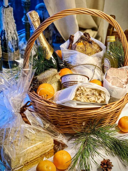 Новорічний кошик: запечена качка, маринована в яліцевих гілках з яблуками симиренка в глазурі з копчених полтавських груш; взбитий щучий кав‘яр з маслом з виноградної кісточки; паштет з печінки фермерської качки; олів’є з телячим язиком та курячою грудкою; салат з ростбіфом, печеними овочами і зеленим копченим майонезом; різдвяний кекс з ізюмом та горіхами; Prosecco prestige De Bernard; солодові та макові булочки; мандарини – 3000 грн.