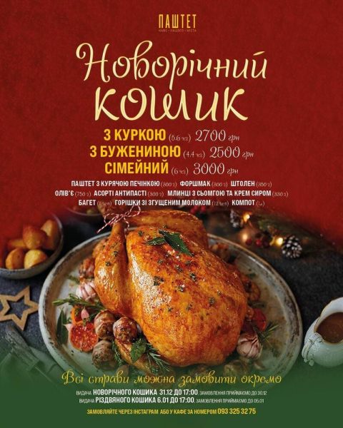 Деталі: Мережа «Паштет» складається з чотирьох демократичних кафе. В закладі рекомендують спробувати фірмові паштети і традиційні страви української кухні в новому виконанні. В закладі приймають передзамовлення на різдвяні та новорічні кошики. Замовлення приймаємо за формою або безпосередньо в закладах: на Різдвяний кошик до Різдва західного обряду до 23 грудня, на Новорічний кошик до 30 грудня, на Різдвяний кошик східного обряду до 5 січня. Приймають замовлення за 48 годин та з повною передплатою.