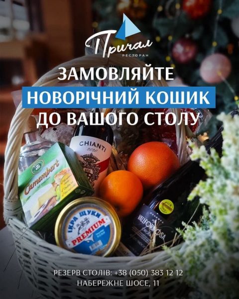 Деталі: «Причал» — це сімейний ресторан на Дніпрі в Наводницькому парку, з якого відкривається захоплюючий краєвид на Дніпро. Щоб ви не переймались за свій святковий стіл чи «з чим прийти в гості», в ресторані підготували кошик, в якому все є. До кошика входить ігристе Cava Vallformosa Origen Brut, вино червоне Chianti Barone Ricasoli 2017, горілка Koskerkorva, набір спецій для глінтвейну та мед, ананас, апельсин, грейпфрут, щуча ікра, чіабатта біла та чорна, лосось слабосолений та вугор, брезаола, копа ді парма, прошуто, салямі, сало та підчеревок, сир камамбер. Приймають передзамовлення до 31 грудня. Замовляйте за номером телефона + 380503831212. Забирайте своє замовлення у ресторані чи з доставкою на таксі.