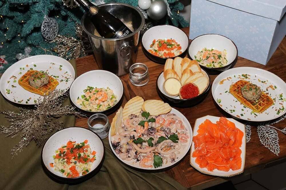 Новорічні страви: м’ясна тарілка, сирне плато, печінкові роли, оселедець з маринованою цибулею, маринади та квашенина, рулетики з лососем та сиром філадельфія, крусарди з крабовим м’ясом, олів’є, смажені спринг-роли з м’ясом та креветками, ребра барбекю з мангалу, курячі крила в пікантному соусі, картопля запечена з розмарином — 2999 грн.