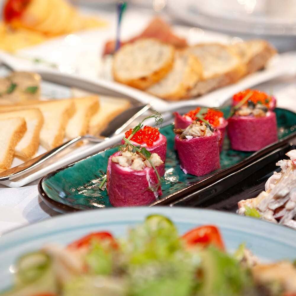 До новорічного столу підготували різноманітні святкові страви: на закуску можна замовити еклери з паштетом з телятини і курячої печінки та тарталетки з лососевим мусом і лососевою ікрою, два варіанти олів’є з лососем та з печеною бужениною, язик з білими грибами, лисичками та ньоками у вершковому соусі, а на основне качку фарширована з білими грибами та маслинами.