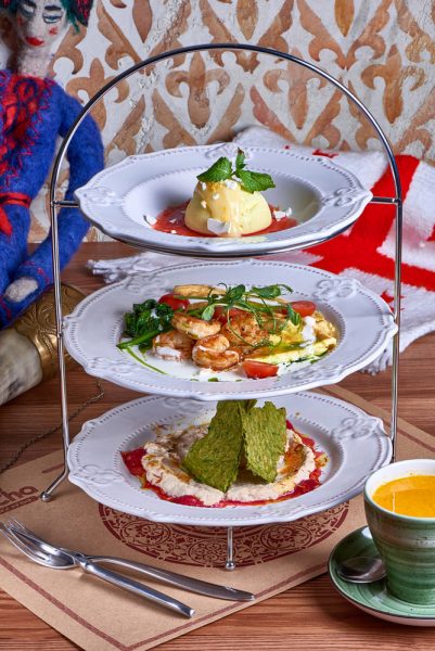На сніданок у ChaCha можна обрати одну з чотирьох ранкових веж (від 300 грн), на яких подають вершково-йогуртовий десерт «Казбек» з лохиною та чорничним кулі, вафлю з беконом або лососем та яйцем пашот з сирним соусом, омлет з сулугуні та креветками з лаймовим мацоні, паштет з курки зі шпинатними чипсами мхалі та кізилово-гранатовим соусом.