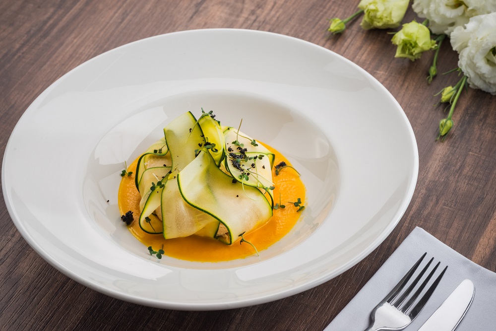 • флан з цукіні та рулетом з яловичини під морквяним соусом – 250 грн;