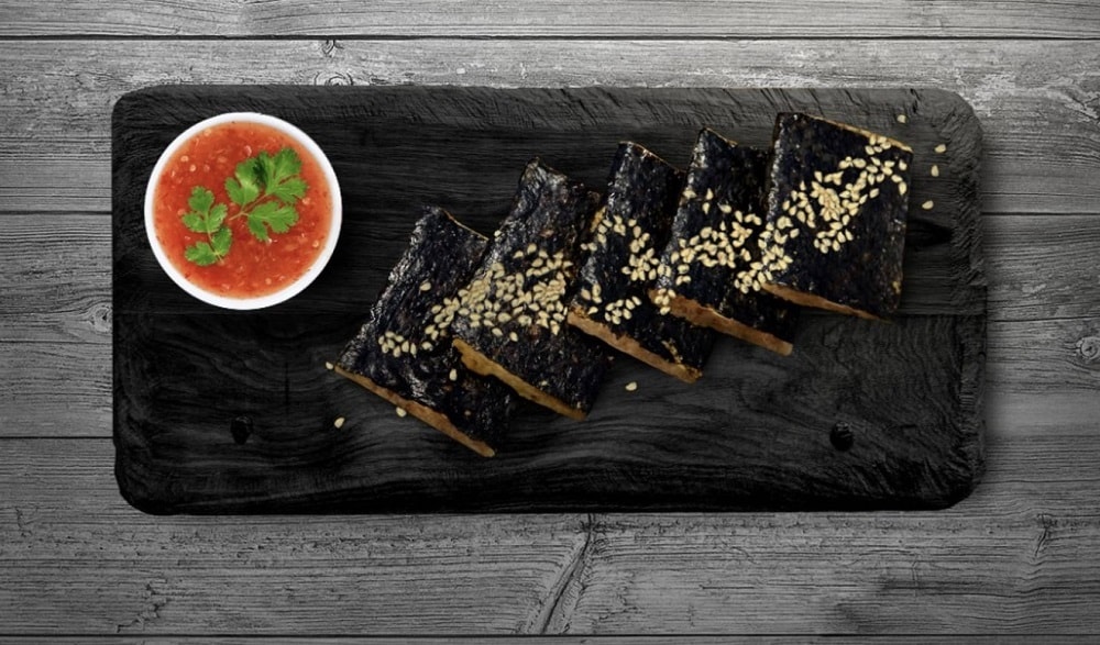 Для початку тофу поріжте пластинками завтовшки 1 см, занурте в соєвий соус та залиште на кілька хвилин. Далі вам потрібно приготувати кляр: змішати нутове борошно, сіль, спеції для риби та воду. Листи норі розріжте на кілька смужок, змочіть в соєвому соусі, обгорніть ними пластинки тофу. Занурте тофу в кляр та обсмажуйте з двох сторін.