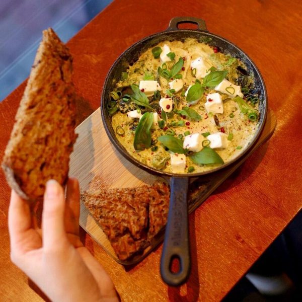 Дещо з меню: кукурудзяний скрембл з фалафелем та печерицями – 175 грн, кабачкові оладки з пряною сметаною – 150 грн, сніданок з мисливськими ковбасками та грибами – 159 грн, вафлі зі скремблом – 190 грн, сицилійська шакшука з базиліком та моцарелою – 175 грн.